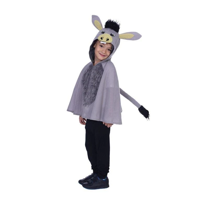 Too cute little Donkey Cape for children. This costume is simple, and effective and much too adorable. Perfect for Christmas Pageants, Book Week and even Shrek themed parties. Grey cape with donkey face hood that has black tuft of hair and big donkey ears. Detachable tail at back of cape.
