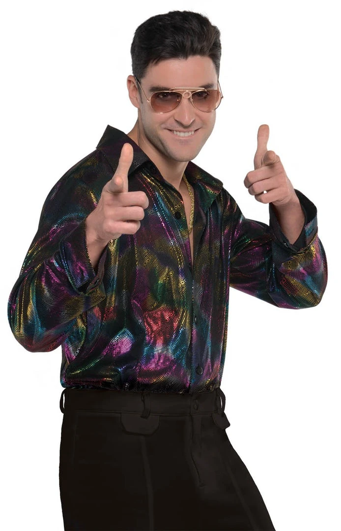 Boogie on down in this funky disco shirt for men. This classic 70s metallic lame’ shirt will have you jive talkin’ and give you disco fever. Team it with a pair of our white flares. Add a chunky medallion and you’ll look dynamite! Shirt only. All other accessories sold separately.