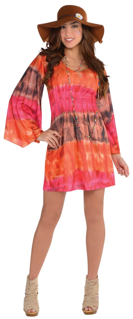 Join the Age of Aquarius and get groovy in this 60s hippy music festival dress for women. Pretend like you’re back at Woodstock in this multi-coloured short stretch dress with long bell sleeves and ruched stretch waist. Dress only. Wear it with this floppy hat and some beads and a peace sign (all sold separately).