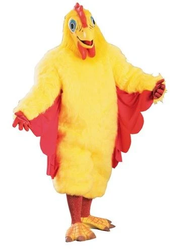 Plush yellow faux fur jumpsuit with red wing ”feathers” on the sleeves. Includes matching full over-the-head mask and hands, knee socks, and shoe covers.