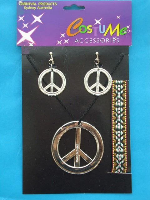 Silver jewellery set with a pair of peace sign earrings, a peace sign necklace and a woven headband.