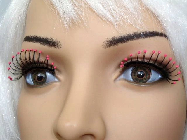 Long black eyelashes tipped with pink droplets. Includes latex glue.Â
