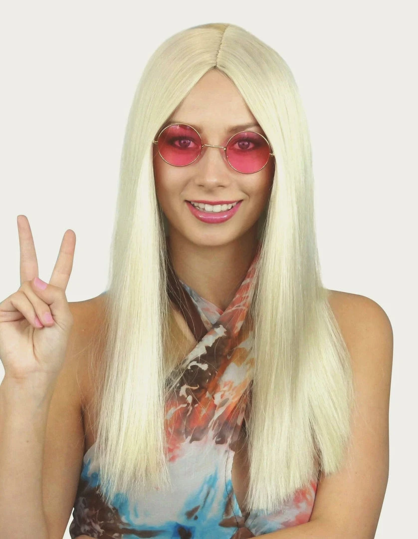 Very nice long soft sleek blond deluxe 60’s to 70’s unisex Hippies costume wig. Peace man.Â
