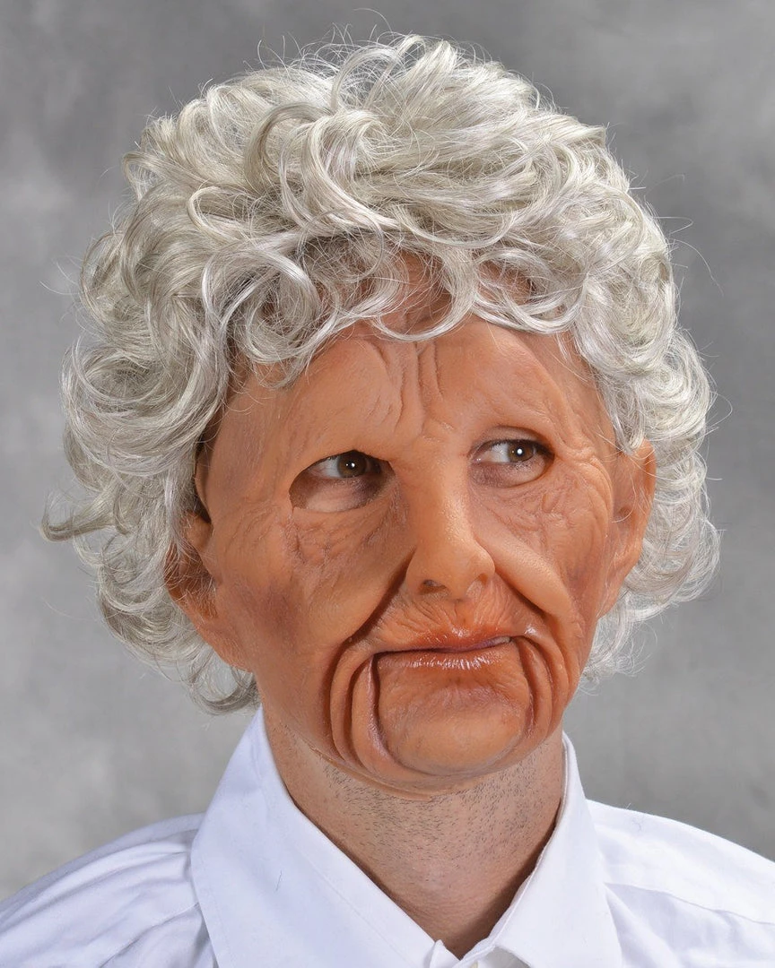 This pleasant old woman mask is great for accompanying any of the super soft old man masks. The face is made of super soft latex and the wig is a synthetic mono acrylic fibers. Hand poured, painted and assembled in the US.