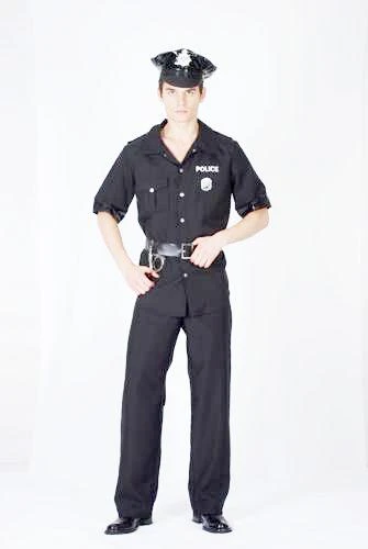 This Black Police US Cop Men Costume includes black shirt with attached badge, pants, hat and belt. Other accessories like handcuffs, cap guns and batons, sold separately.