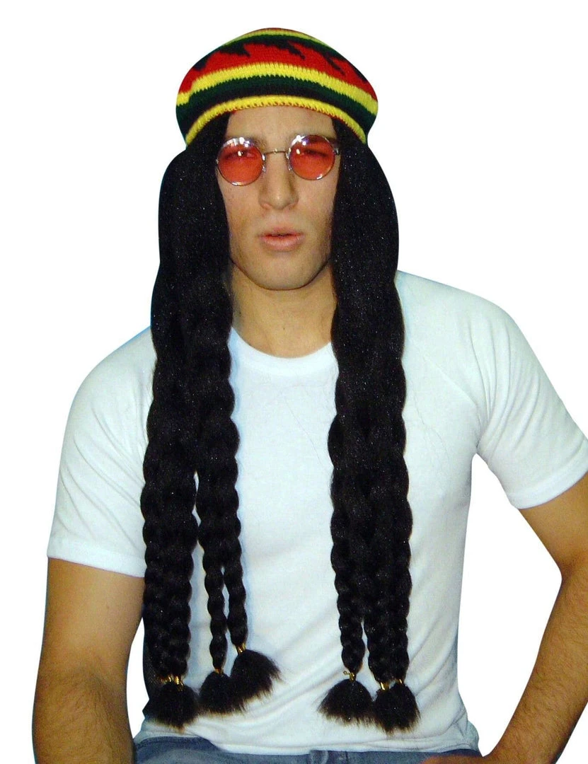 Let loose your inner Bob Marley or Whoopi Goldberg in this Jamaican rasta dreadlocks wig with knitted hat costume accessory. Ideal for fancy dress parties, standup comedy routines, school or community stage plays, or when you just want to sport a different look.