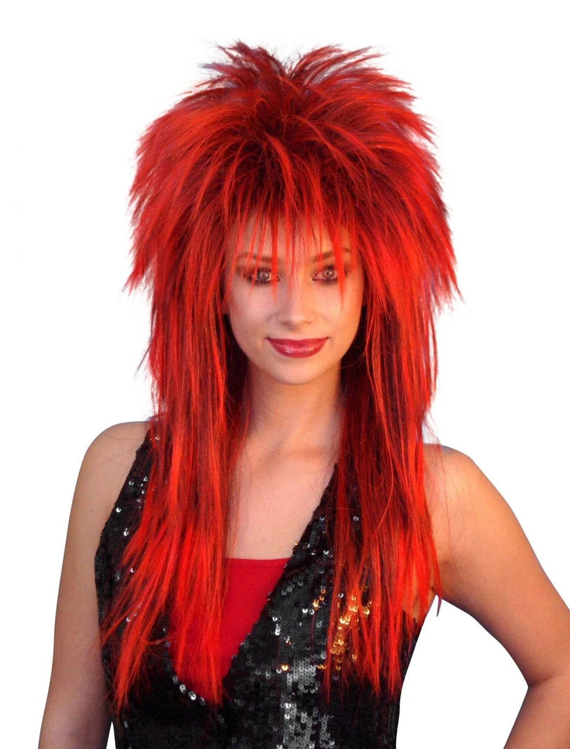 Spiky long mullet wig with red streaks. Great for 80s Cindy Lauper or any kind of punk rock gal!Â