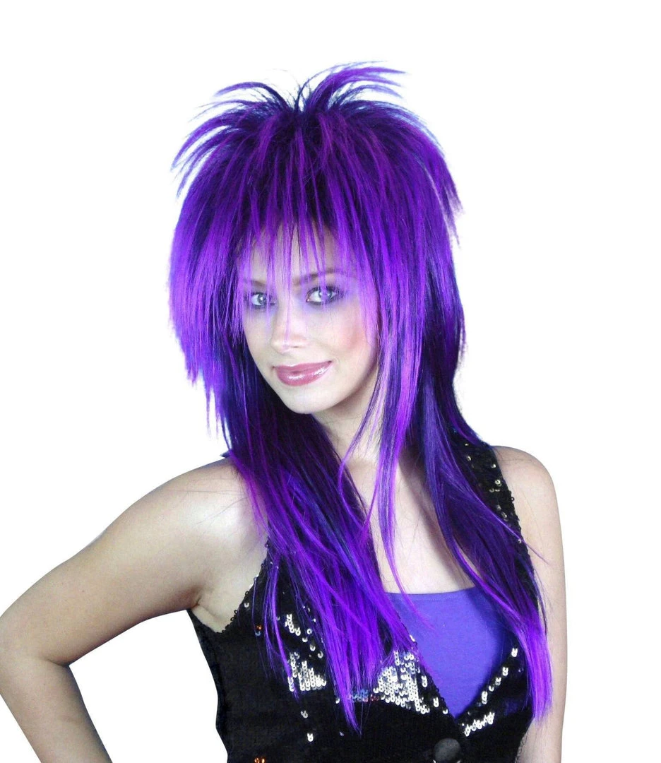 Spiky long mullet wig with purple streaks. Great for 80s Cindy Lauper or any kind of punk rock gal! Also comes in green, red and purple.