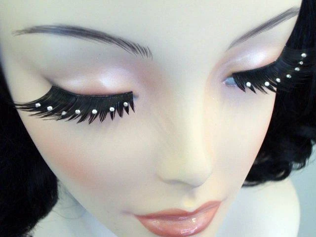 Thick black false lashes outfitted with silver crystals in the middle. Perfect for flappers or a glamorous Hollywood look. Includes latex glue.