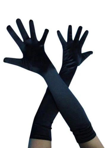 Long soft shiny stretch satin lycra deluxe elbow length black gloves. Also in white, red and pink.