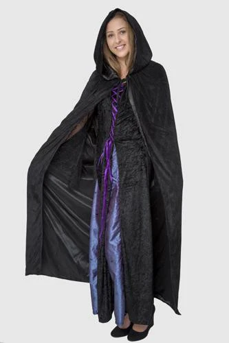 Long velvet hooded adult size capes. Reversible capes lined in a range of satin colours. Wear these at Halloween, Book Week, for Medieval and mystical themed parties. Versatile costume piece. Easy to wear. Goes with a range of costumes. Cape only. Dress and any other items sold separately.