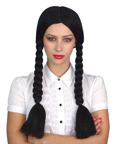 This Wednesday Adams wig is a black wig with two plaits. Also works as an American Indian maiden.Â