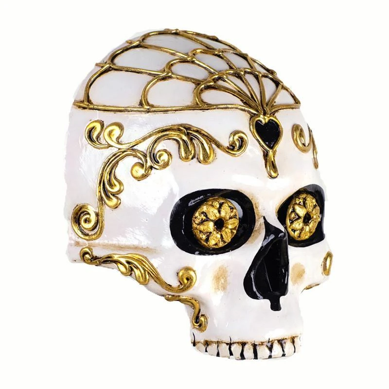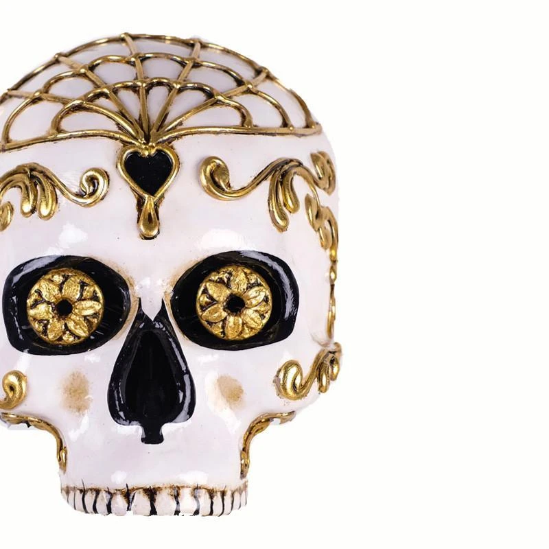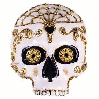 This half scull day of the dead mask is made from traditional materials. A strong and striking mask for masquerade parties or for display in your home, this mask stays in place with black ribbon.