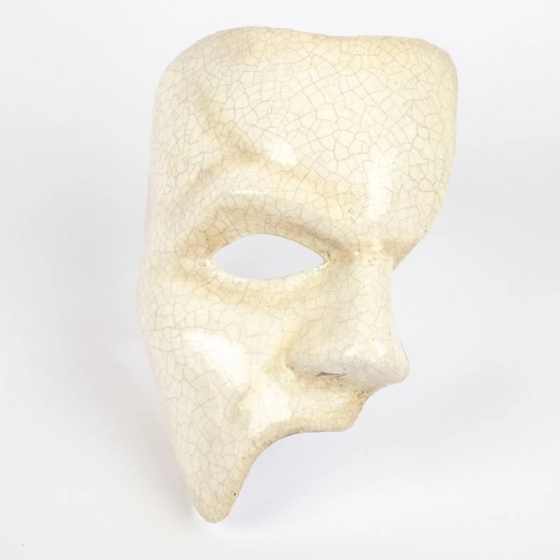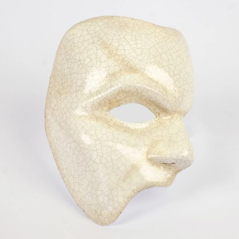 Phantom of the Opera mask finished in antique crackled porcelain look. A half face male mask to delve into the mysteries of the fantasy novel by Gaston Leroux. Handmade in Venice, Italy. Comes with certificate of authentication.