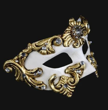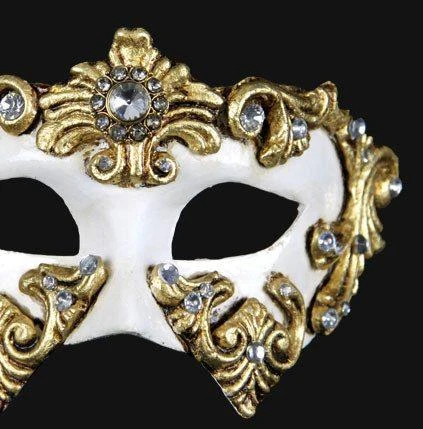 Handmade in Venice, this white and gold eye mask is Inspired by the elegant patterns of baroque decorations in Venetian furniture. Comes with a certificate of authentication and secures with a black ribbon.Â