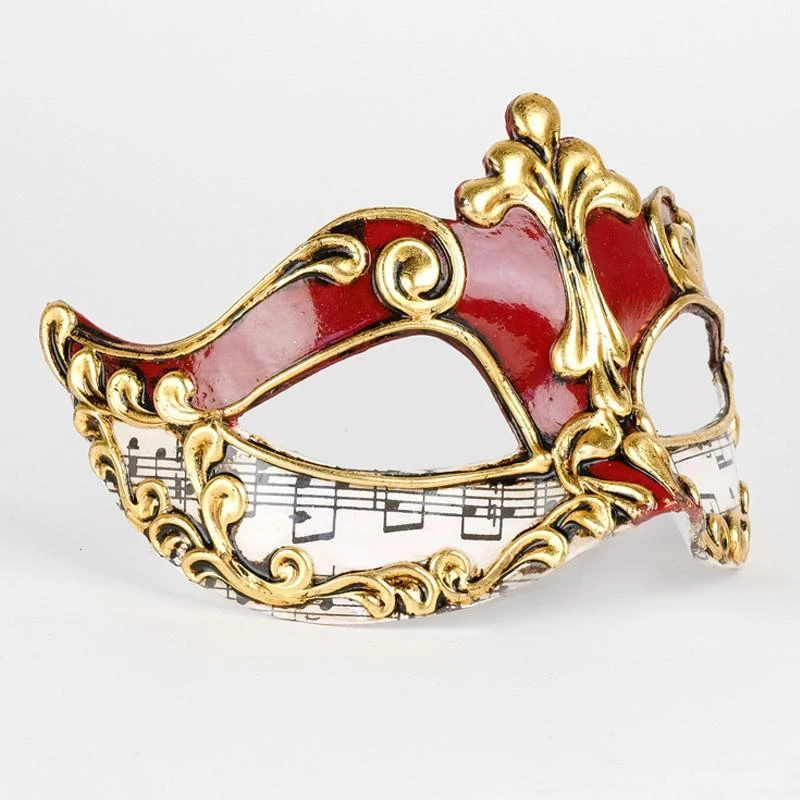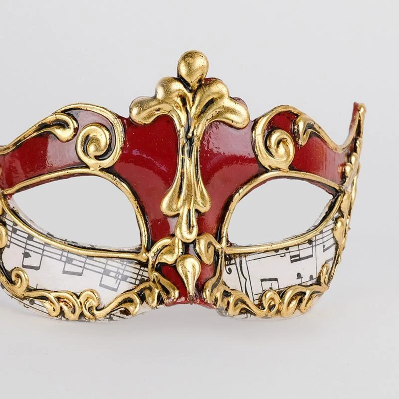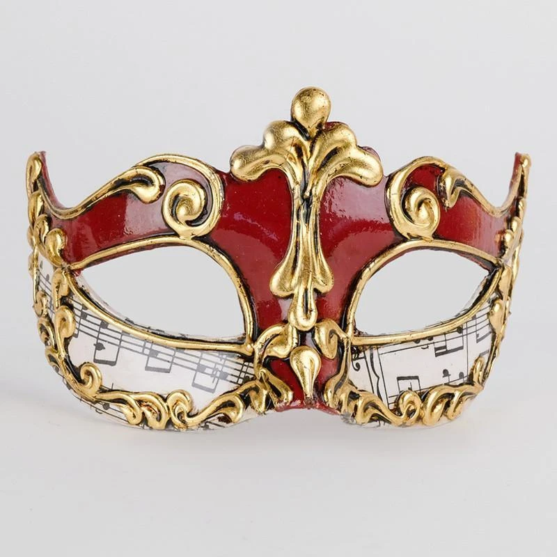 Suitable for both men and women, this red and gold Venetian mask with music Paper is inspired by the traditional colours and motifs of the Venice Carnival. Handmade in Venice, comes with a certificate of authenticity and secures with a black ribbon.