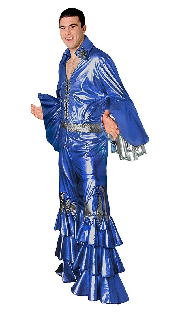 Get the band back together! Matching men’s and women’s Abba Mamma Mia Jumpsuit Costumes for Hire. Absolute top quality Abba costumes. This outrageous male Abba costume in blue and silver includes shirt with huge bell sleeves and separate matching pants with tiers of flares. Comes with a matching silver sequin stretch belt and your choice of 1970s style wig.