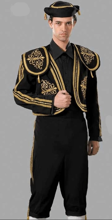 Flamboyant matador Spanish bullfighter costume. This extravagant black and gold men’s hire costume includes black jacket with heavy gold embroidery and trim, matching knickers and traditional hat. Stocking socks sold separately.