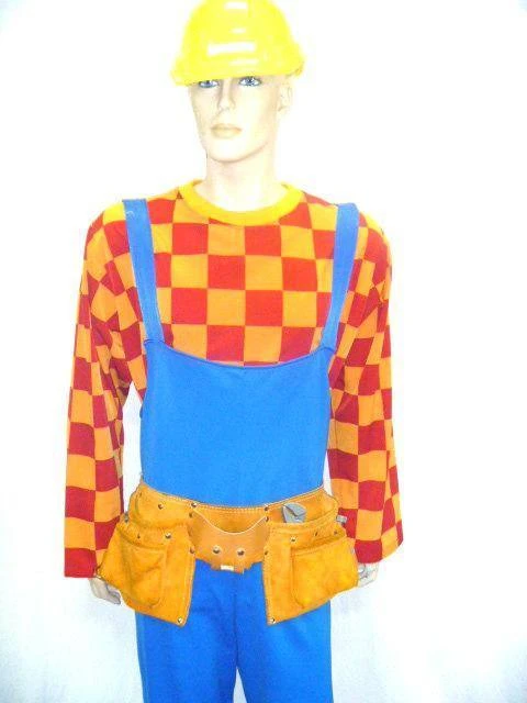 Large orange & red chequered, long-sleeved t-shirt, blue overalls, yellow hard hat, tool belt.