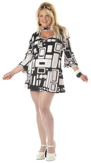 Groovy 1960s and 1970s style Go Go Costume to hire. Costume includes black and white print mini dress, headband, go go boots and wig of your choice. Our boots come in white, pink, yellow, silver, green, red, black. We have numerous wigs to choose from.
