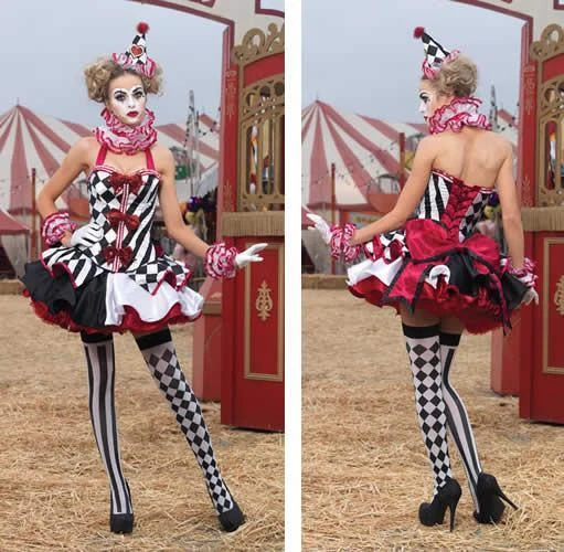 Costume includes sequin trimmed satin halter corset with silhouette boning and cascading wired hem, layered petticoat skirt, satin trimmed wrist cuffs and matching neck ruffle, clown hat head piece, and detachable snap-on oversized back bow.