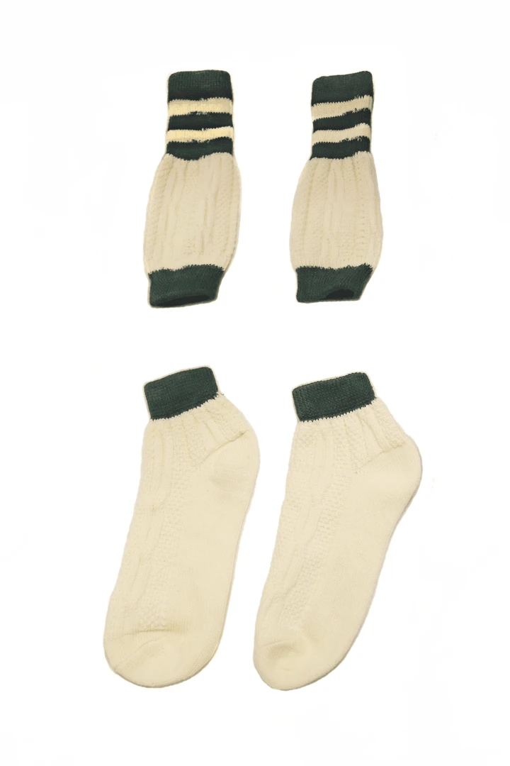 Traditional Bavarian men’s two part socks. They’re actually a thing. A traditional thing worn with shorter Lederhosen at Oktoberfest in Bavaria. The Loferl socks are a pair of socks in two parts: a foot sock part and a calf sock part. They are off white with green trim ribbed knitted socks. We also sell regular Oktoberfest ribbed knee hi socks. Show off your ankles with these Loferl socks and your quads with the shorter, above knee Lederhosen. (See the third image of actual Germans wearing this type of socks.)