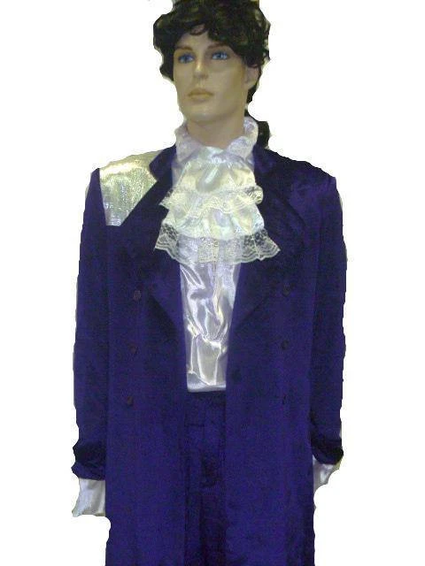 Purple velvet purple rain suit – oversized jacket with diagonal button up and frilly cuffs, frilly jib, high-waisted trousers.