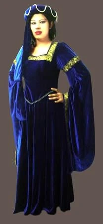 Lush blue velvet dress with gold brocade and fur-trimmed bell sleeves. Comes with matching hat.