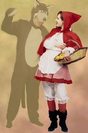 Creme coloured blouse matched with red gingham skirt with creme apron, creme knickerbockers, red gingham bonnet, red cape with hood.