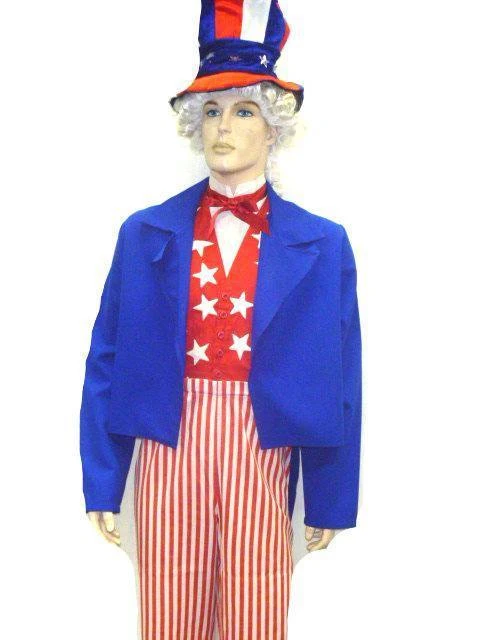 Red & white striped trousers, red vest front with white stars, blue tails jacket, large stars & stripes hat