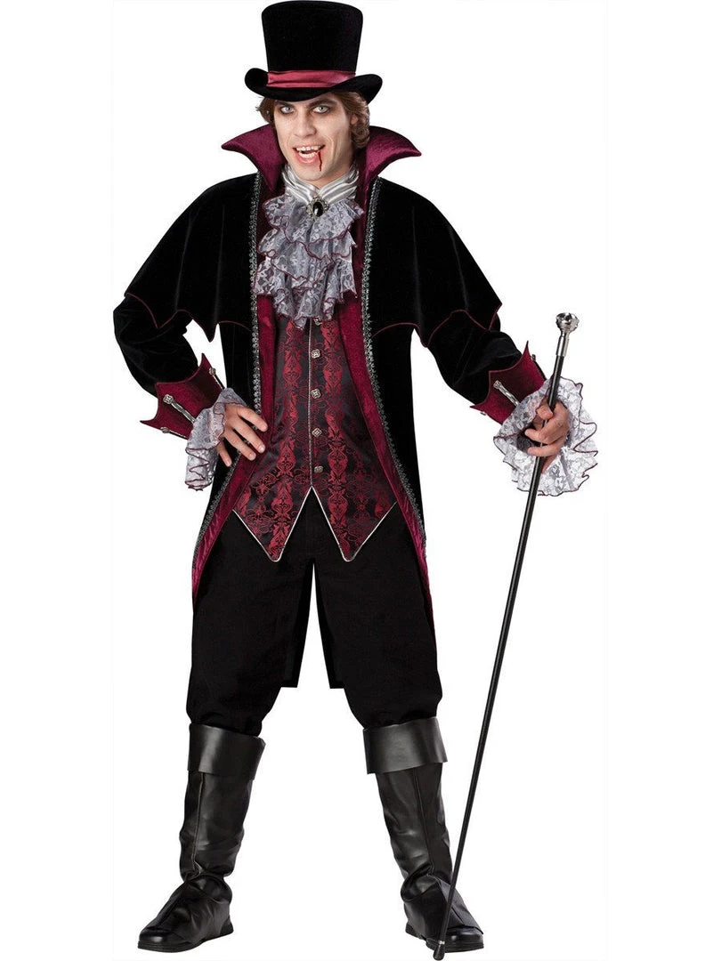 Vampire of Versailles costume includes long velvet coat with attached capelet and lace sleeves, brocade vest with attached dickie, pants, velvet top hat and boot covers.