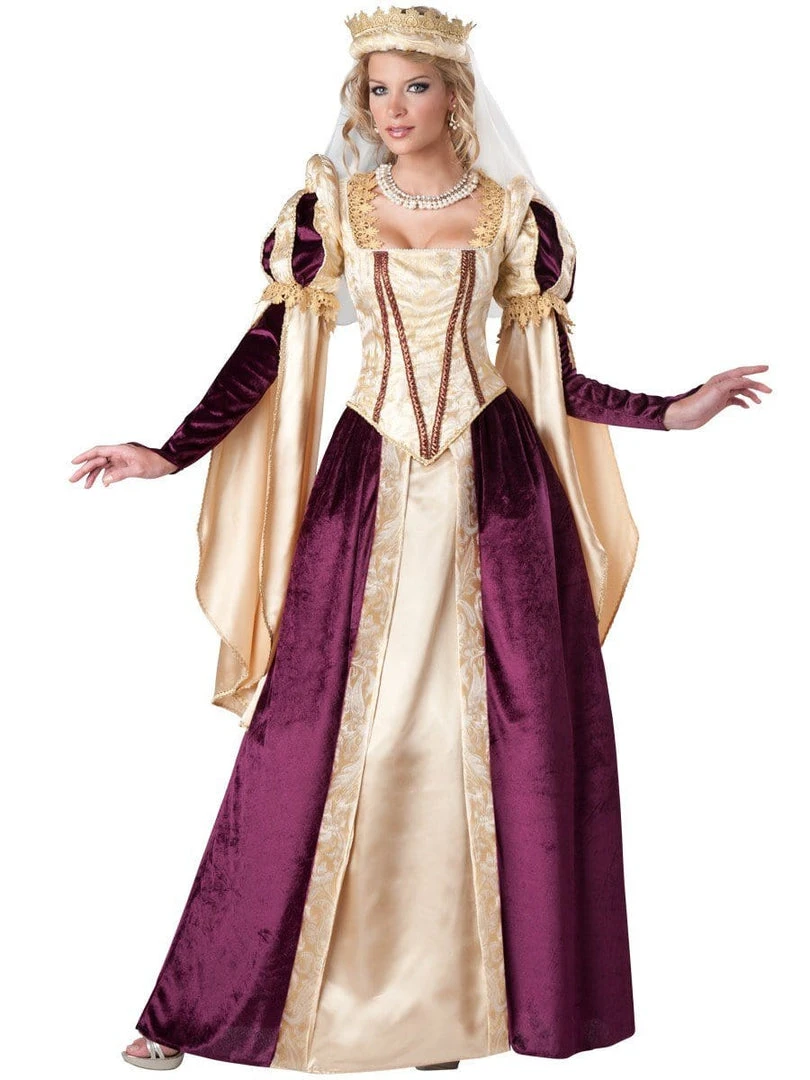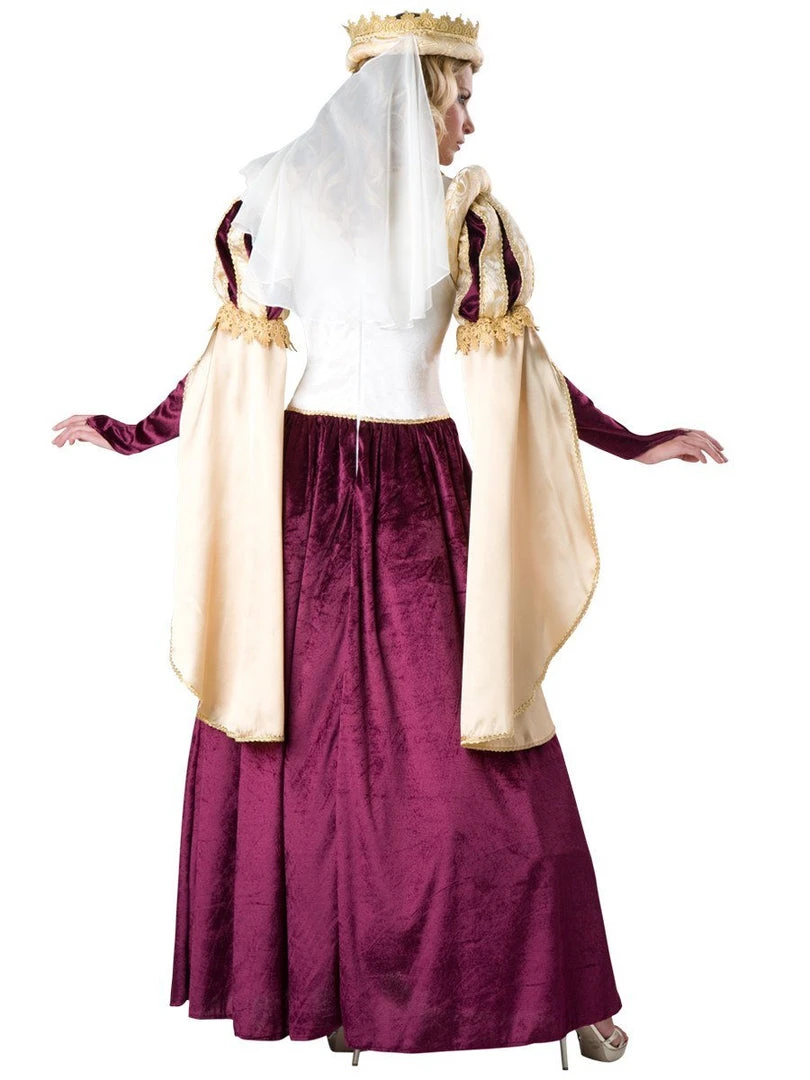 Lush and regal Medieval style ladies’ costume. Brocade, panne and satin dress with gold lace details. Long tulle petticoat for underneath and headpiece with gold lace trim and sheer veil. Jewellery not included. Perfect for playing the Game of Thrones as one of the conniving queens of Kings Landing, like Cersei, Margaery or the indomitable Olenna Tyrell, Queen of Thorns. Gorgeous costume to wear to a medieval banquet.