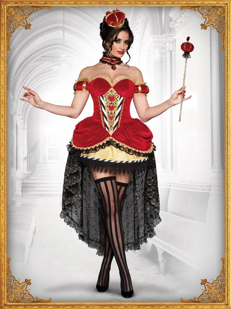 Costume Confidential’s Queen of Hearts costume includes: Red velvet and gold brocade dress with corset-like boning and embroidery and lace trim accents, gold brocade underskirt with attached petticoat, red velvet choker with lace trim and red heart jewel drop pendant and mini red velvet and gold brocade crown with gold trim and rhinestone heart accents