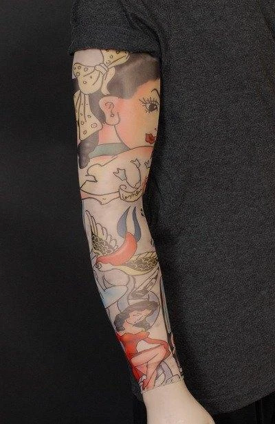 Tattoo sleeve for one arm, featuring an Old School design with pin-up girls.