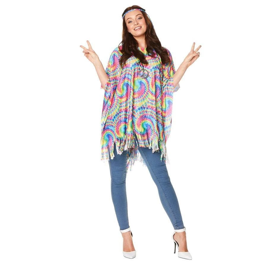 Totally tripping man. Get groovy in this adult size 60s 70s style tie dye hippie poncho. This is an easy costume to take you back in time to the Summer of Love. Comes with matching headband so just slip on the poncho, tie on the headband and hey man, cool. Unisex costume suitable for men or women.
