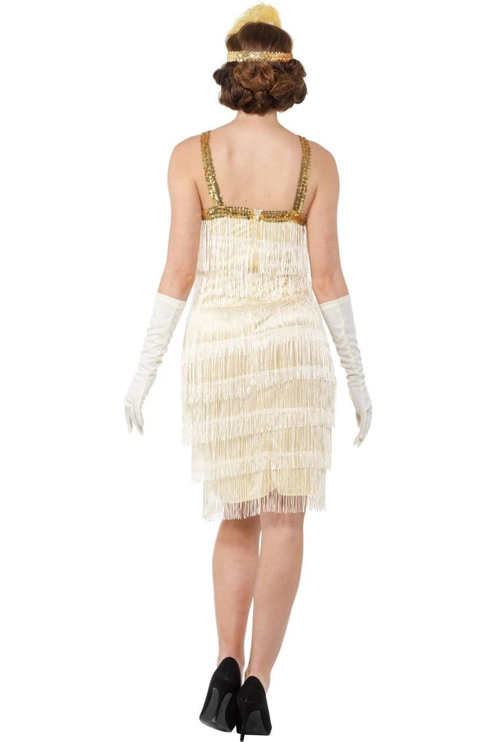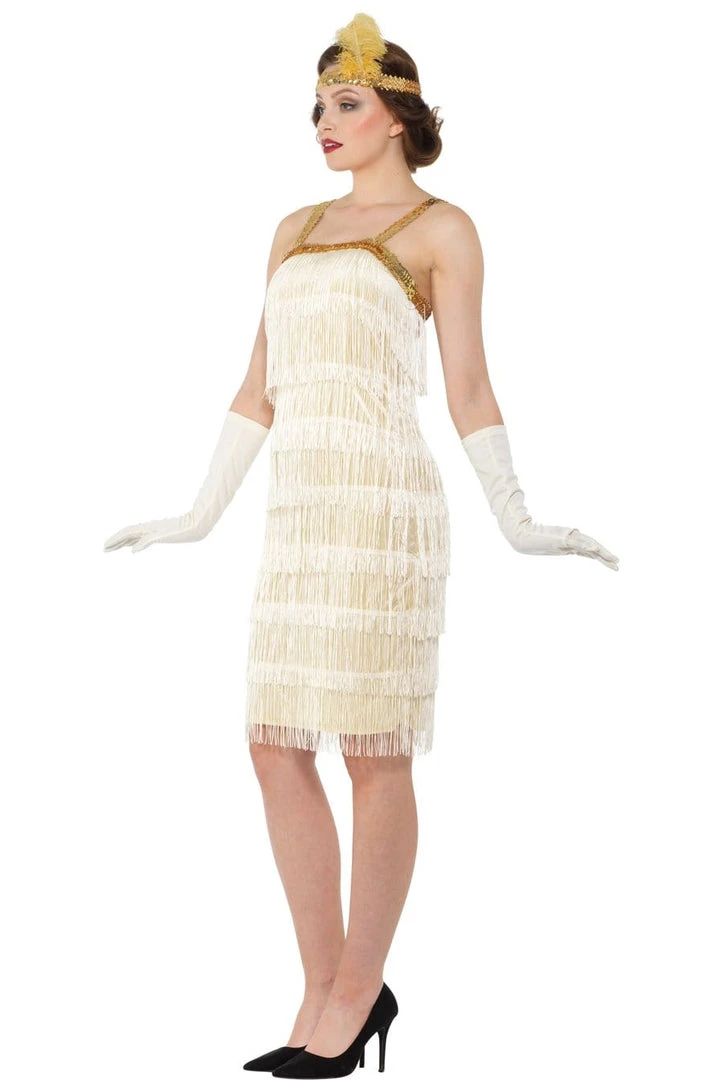 Get ready to kick up your heels and dance right into the 1920’s in this elegant Gatsby inspired costume. Comes complete with an elegant ivory coloured velveteen stretch flapper dress covered front and back with fringing and with gold sequin trim, long gloves and gold sequin headband with feather.