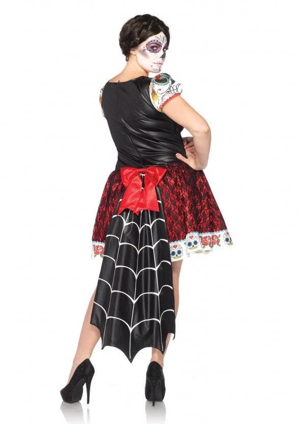 Costume includes red satin dress with black lace overlay, bone print on bodice and skull motif on sleeves and at hemline. Large detachable bow at back with spiderweb print. Â Petticoat and other gloves also included.