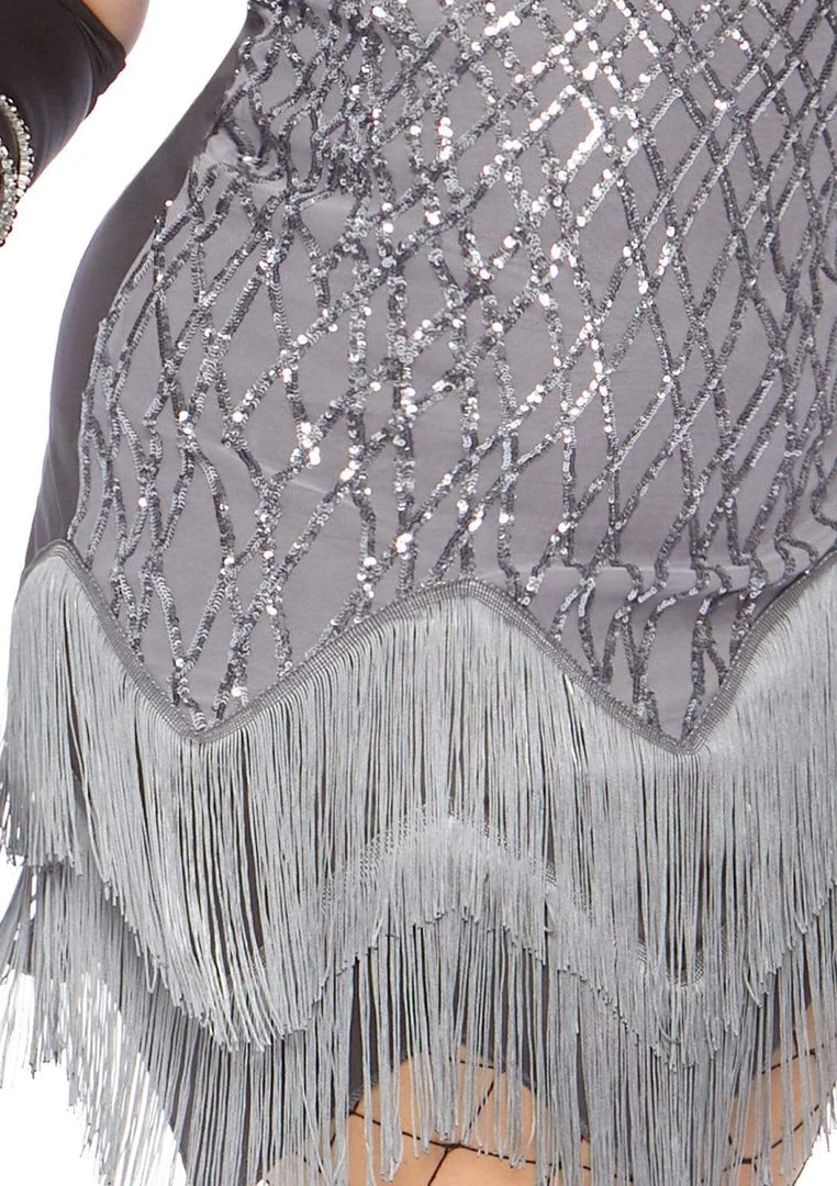 Shimmer and shine in this sexy silver sequin 1920’s style flapper costume available in two curvy plus sizes. This beautiful Roaring Roxy costume will stand out in the crowd at any Gatsby or 20s themed party or event. Costume includes fitted silver dress with criss cross silver sequins, zig zag fringed hem and matching sequin headband. Gloves, jewellery, hosiery and all other accessories sold separately. Also available in sizes S, M, L.