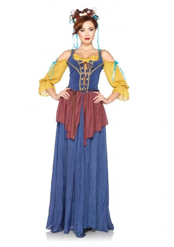 Costume includes full length dress with lace-up bodice and off the shoulder top. Comes with floral headband.