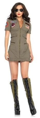 Iconic 80s action film Top Gun, costume for women. Out manoeuvre the boys in this classic 1980s Top Gun Flight Dress. This sassy and fun hire costume includes short stretch khaki zip up dress with belt and interchangeable Maverick or Goose name patches. Hosiery and aviators sold separately. Boots not included.