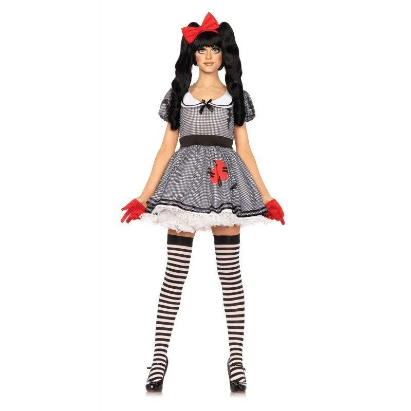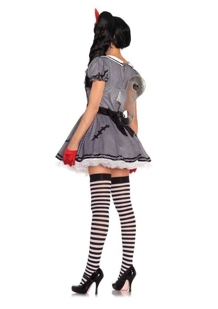 Wind-Me-Up Dolly Halloween costume for adults includes gingham dress with heart detail and attached petticoat and silver turn key accent, headband, a wig. Shoes available at additional hire. Make-up, gloves, hosiery and all other accessories sold separately.
