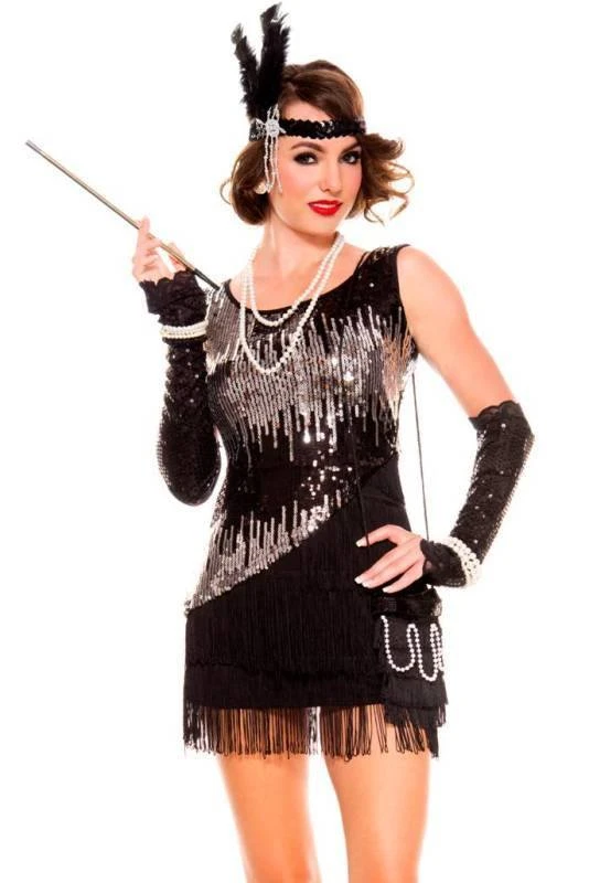 Shimmer and shine in this Gatsby Flapper dress. Costume includes asymmetrical silver and black sequin fringed dress and cigarette holder. Headband, gloves, beads and hosiery sold separately. (Bag not included)
