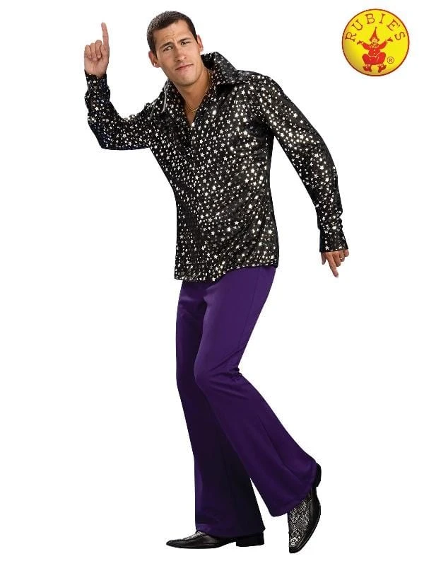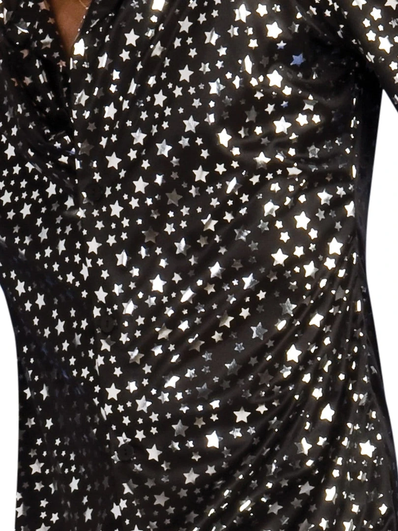 Be the star of the disco dance floor is this shining example of a 70s Disco Shirt. Black shiny shirt printed with silver stars. Shirt is typical 1970s style, with wide lapels. Team this shirt with wide flares, medallion, afro wig and you will burn baby burn, be a disco inferno!