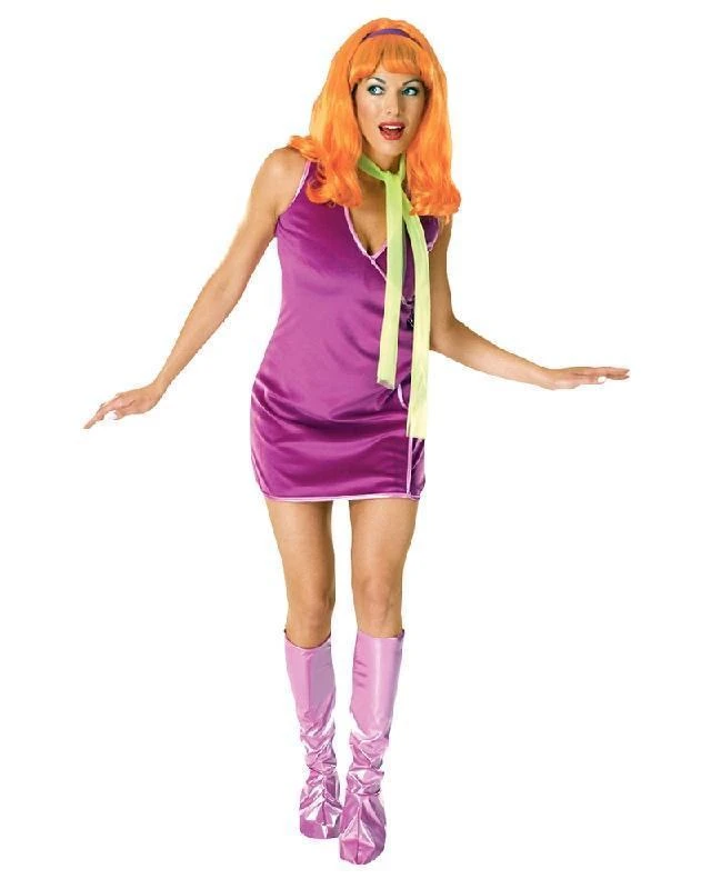 Daphne, the “pretty” but danger prone girl from the Scooby Doo Gang. Daphne costume for adults includes dress, wig, neckscarf and boot tops.