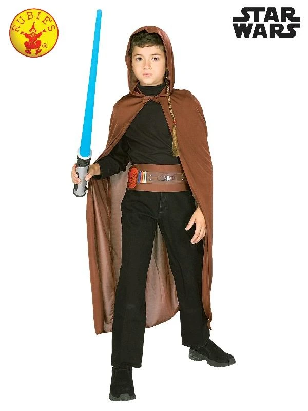 Star Wars Jedi Knight accessory set for children includes brown hooded cloak, matching belt, light sabre and Obi Wan style clip on rat tail.  ” A Jedi must have the deepest commitment, the most serious mind”. Let the force be with you as a Jedi Knight.Â