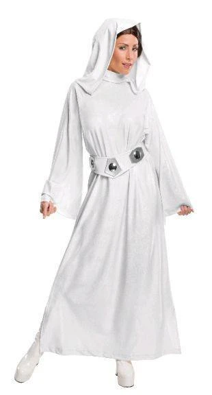 Hire this extravagant deluxe Star Wars Princess Leia costume for women. Costume includes flowing white hooded gown. Fabric has subtle glitter sheen. Costume comes with belt and wig. Hire also white gogo boots to complete your Princess Leia costume.