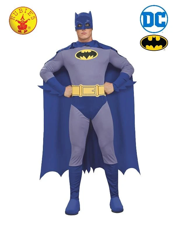 By day he was the eccentric Gotham City tycoon Bruce Wayne, but by night Batman was the fearless Gotham City Crime fighter. With side-kick Robin, this classic superhero uses his batarangs, bat cycle and bat mobile to out-smart the villains. This classic Batman Brave and Bold jumpsuit costume for adults includes: