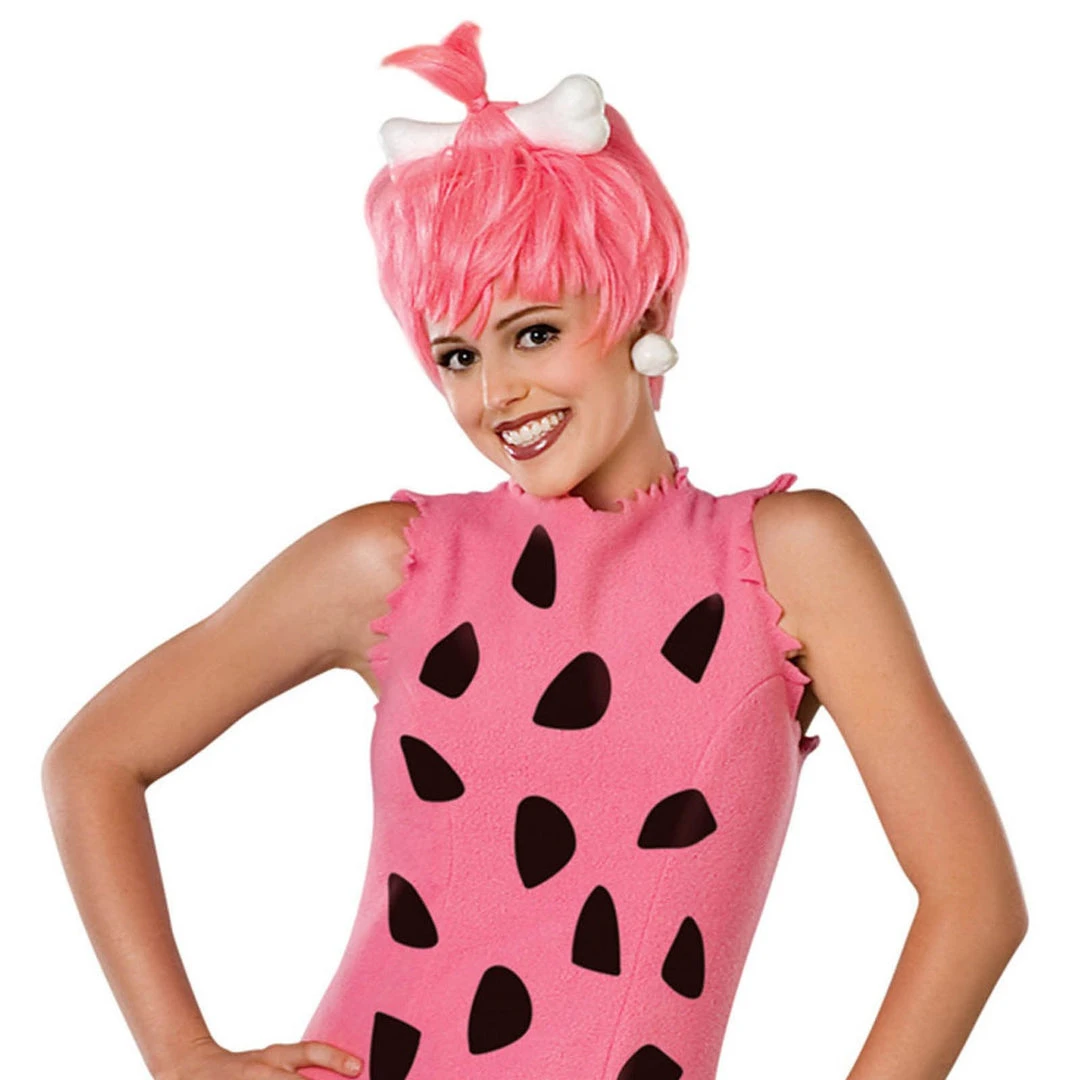 Fred and Wilma Flintstone’s adorable baby Pebbles Flintstone. This cute Pebbles costume for adults includes pink top with black spots, black shorts, leg covers and pink wig with soft bone. Jewellery not included. Â