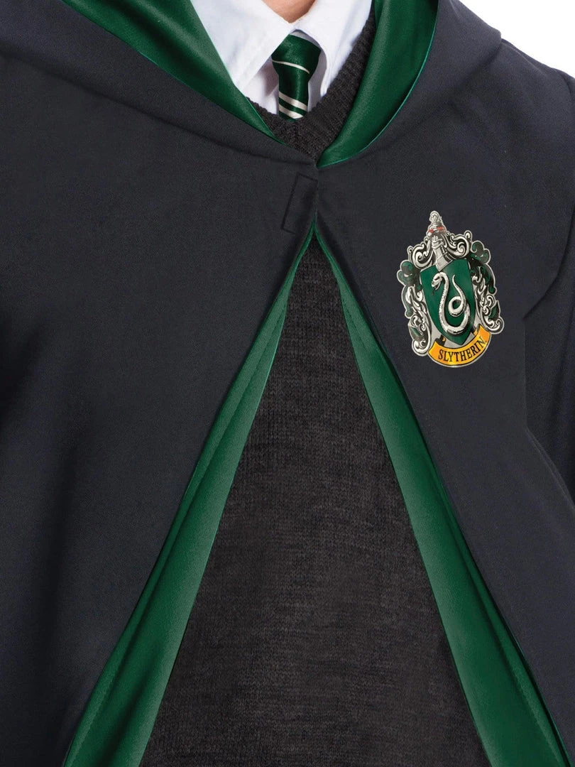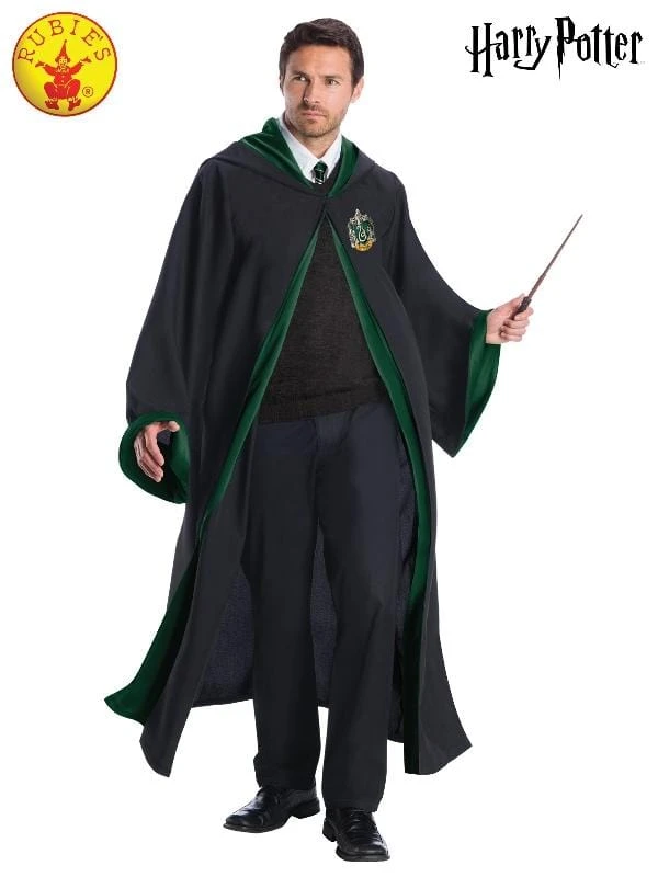 Adult Hogwarts robe in Slytherin house colours. Black robe with hood lined in Slytherin green and Slytherin crest on front of robe. Robes available from all four Hogwarts’ houses. Dress as Draco Malfoy, Severus Snape, Bellatrix Lestrange or Voldemort at Book Week or Halloween.