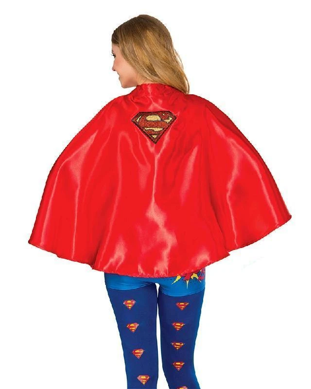 Red satin Supergirl  cape with red and gold S symbol for Supergirl or Superman (for boys). Package contains cape only. You can’t be a superhero without a cape.